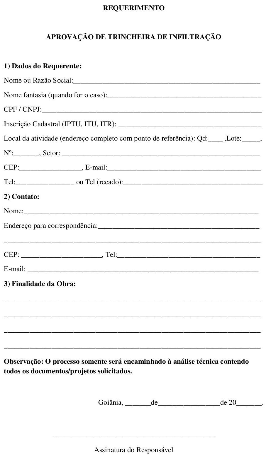 Observação 2: Poderão ser exigidos outros documentos/projetos, à critério técnico, conforme características da obra, bem como, do local onde a trincheira será instalada.
