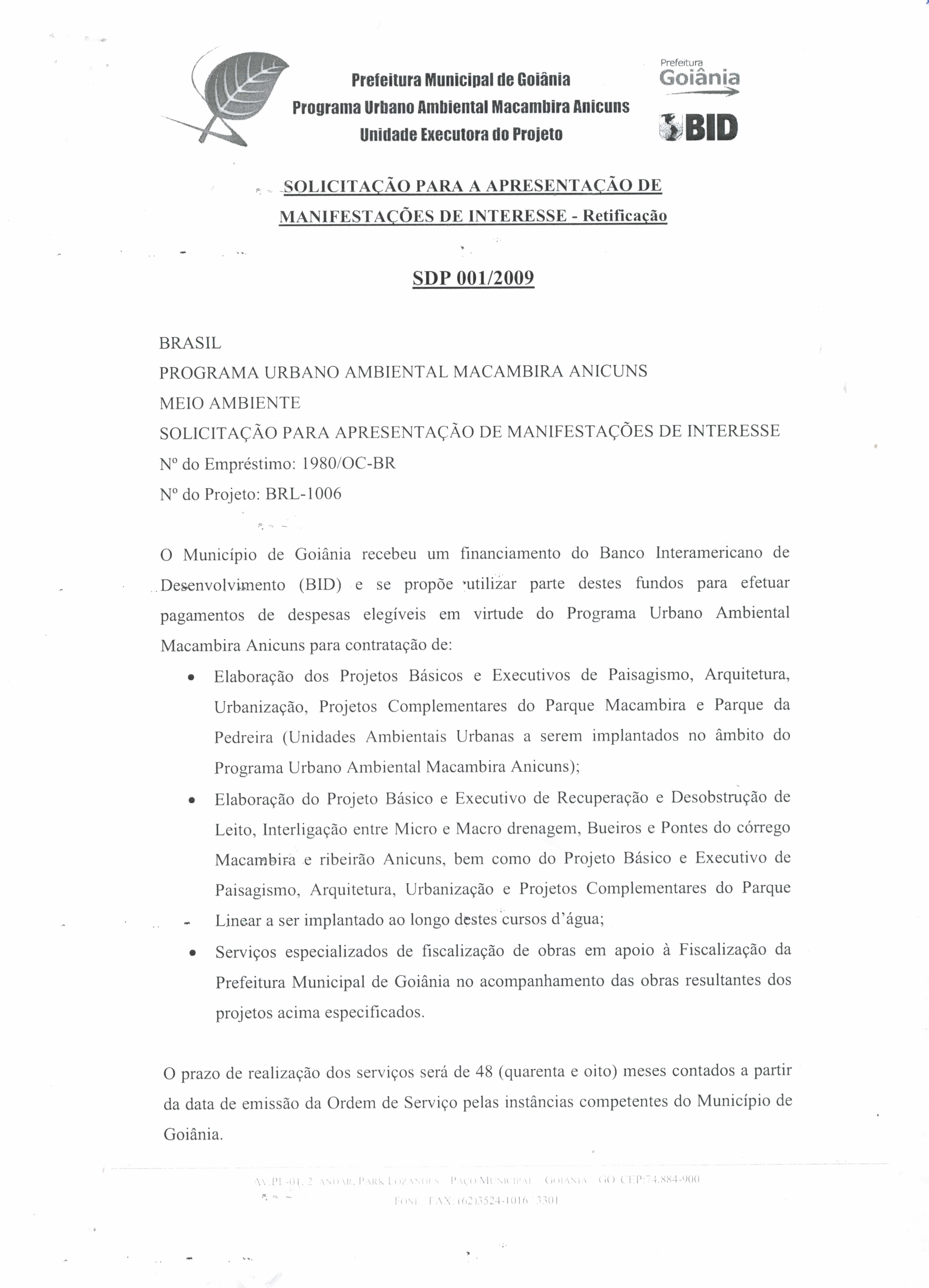 Elaboração do Projeto Básico e Executivo de Recuperação e Desobstrução de Leito, Interligação entre Micro e Macro drenagem, Bueiros e Pontes do córrego Macambira e ribeirão Anicuns, bem como do Projeto Básico e Executivo de Paisagismo, Arquitetura, Urbanização e Projetos Complementares do Parque Linear a ser implantado ao longo destes cursos d'água;