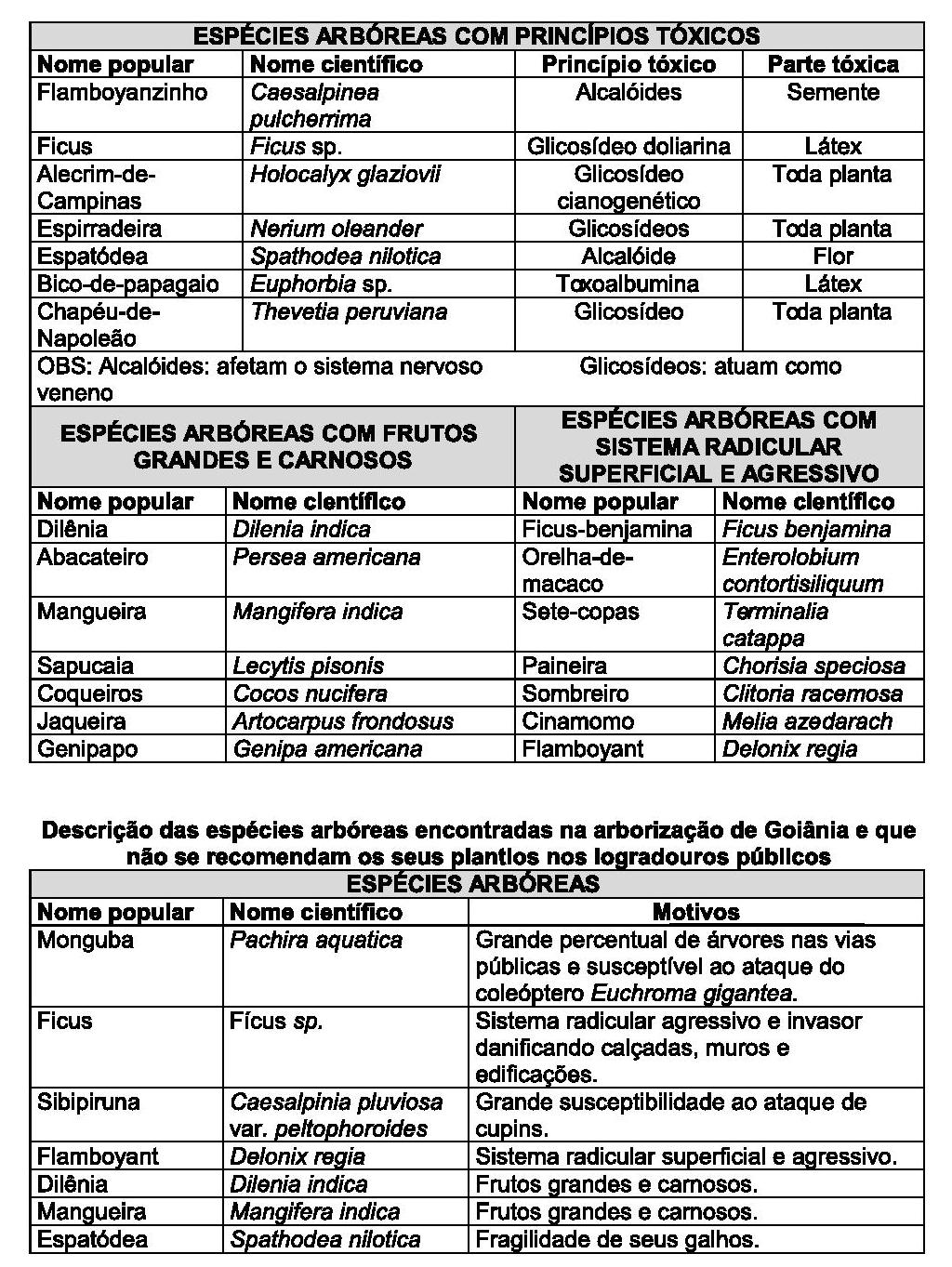 Descrição das espécies arbóreas que não devem ser utilizadas na arborização dos logradouros públicos devido às caracteristicas de seus frutos, raízes e por possuírem princípios tóxicos.
