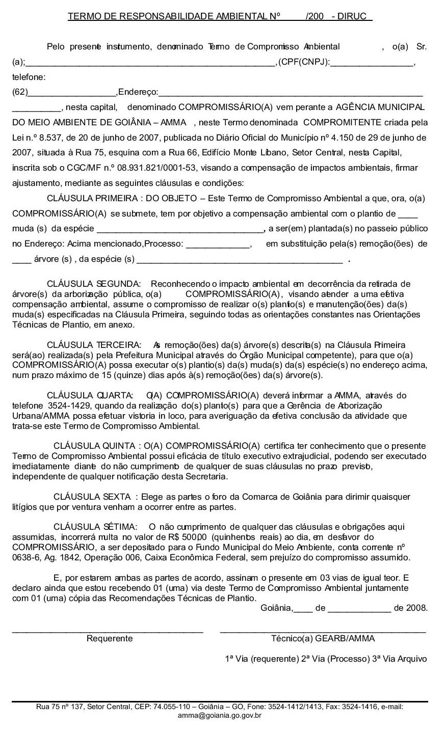 Art. 33. Para a liberação da autorização de remoção da(s) árvore(s) deverá ser firmado Termo de Compromisso Ambiental, a ser assinado pelo requerente em 03 (três) vias, responsabilizando-se pela doação da(s) muda(s) com as espécies indicadas pela AMMA. (Redação da Instrução Normativa nº 030, de 05 de setembro de 2008.)