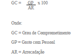 § 1º Para cálculo do grau de comprometimento serão considerados os somatórios da arrecadação e dos gastos com pessoal dos 12 (doze) meses anteriores ao mês do reajuste, utilizando a seguinte fórmula: (Redação da Lei nº 7.215, de 13 de julho de 1993.)