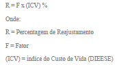§ 2º Calculado o grau de comprometimento, aplica-o à tabela abaixo para encontrar o fator que multiplicado pelo índice do Custo de Vida (ICV), medido pelo DIEESE do mês anterior, fornece o percentual de rejauste do mês, de acordo com a fórmula: (Redação da Lei nº 7.215, de 13 de julho de 1993.)