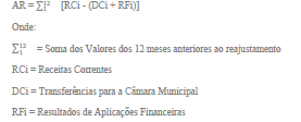 § 5º Considera-se Arrecadação as receitas correntes do Município, deduzidos os repasses à Câmara Municipal e os resultados das aplicaçdes financeiras, considerando os valores nominais de acordo com a seguinte fórmula: (Redação da Lei nº 7.215, de 13 de julho de 1993.)