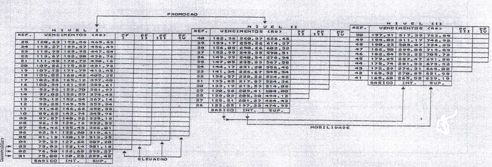 II - estrutura da carreira, com os níveis e as referências de vencimentos; (Redação da Lei n.º 7.403, de 28 de dezembro de 1994).