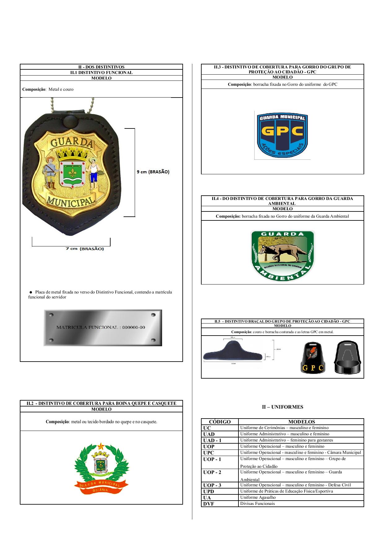 O distintivo de cobertura para boina será confeccionado em metal com suporte para ser fixado na mesma, e no quepe e casquete será bordado. O fundo geral de sustentação produzido em metal e na cor azul marinho, de forma ligeiramente ovalada, com corte reto na parte inferior de 30 mm, com as dimensões gerais de 65 mm transversalmente por 57 mm de altura (diâmetro total); no alto do círculo, uma estrela de 5 pontas, na cor vermelha, cujas pontas superiores são ligadas ao arco externo e as duas outras (da direita e da esquerda), encontrando-se com as pontas dos ramos laterais; abaixo da estrela, o escudo de Goiânia, nas mesmas condições do contido na Bandeira da Guarda e nas mesmas cores, com a respectiva faixa, também igual; o escudo deverá ter a coroa tocando as duas pontas inferior da estrela; em torno do escudo, dois ramos verdes, com os troncos cruzados abaixo da faixa, presos por um laço na cor amarelo-ouro, com as pontas da fita pendentes, e as pontas dos ramos ligados à estrela; na extremidade inferior dos ramos (tronco), uma faixa na cor vermelha, de 6 mm de largura, por 57 mm de comprimento, em “esse” (S), contendo no seu interior em letras de forma, na cor preta, as palavras “GUARDA MUNICIPAL”; abaixo da faixa, entre esta e o corte inferior da estrutura do Distintivo, sobre o fundo de cor cinza, a palavra “GOIÂNIA”, também em letras pretas;