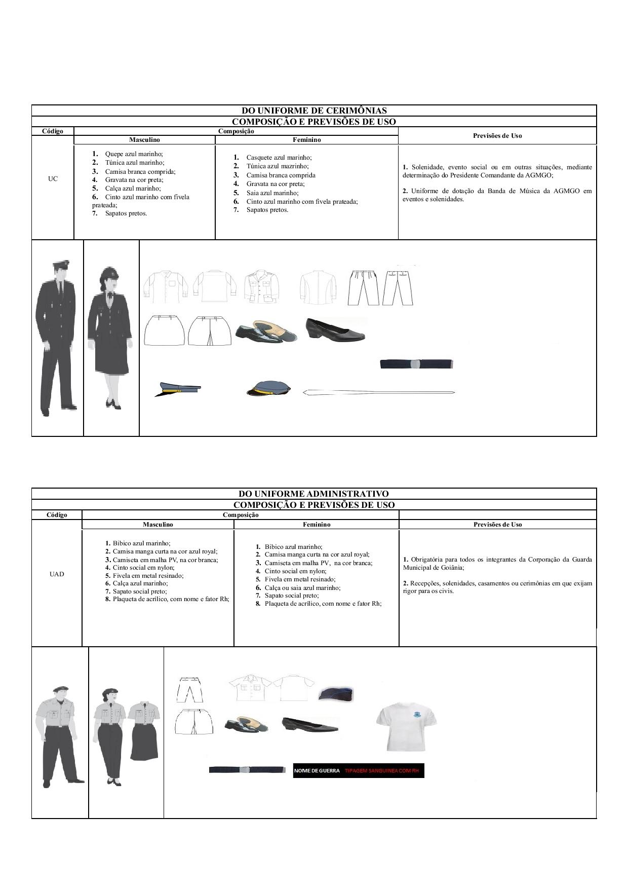 Confeccionada em tecido de tergal, na cor azul marinho, aberta na frente em toda a extensão, e fechada por seis botões de matéria plástica, de 8200/18 mm, na cor bege, massa 1,60u, equidistantes, ficando o primeiro na altura da gola e o último a 50 mm, aproximadamente abaixo da cintura. Na parte superior, a altura do peito, dois bolsos retangulares, com uma dobra saliente de 30 mm em todo o corpo do bolso que mede 125 mm X 155 mm, com cantos quebrados, fechados por lapelas retangulares de cantos quebrados, medindo 125 mm X 60 mm, tendo ao centro, e 20 mm acima, um corte de 20 mm destinado a receber o botão que nasce do centro da saliência já descrita. A costura da lapela do bolso esquerdo sofrerá solução de continuidade, em um espaço de 35 mm, a partir da direita para a esquerda, local esse destinado à colocação de canetas. Nas costas e distante 95 mm da base da gola, no sentido descendente, uma costura de ombro a ombro e duas pinças de 15 mm que se iniciam na costura, 100 mm das mangas, e se estendem até a barra da camisa. Gola tipo colarinho duplo, inteiriço. Platinas da mesma cor e tecido, de forma pentagonal, embutidas nas mangas, medindo 55 mm de largura na parte fixa e 45 mm na parte solta, terminando em ângulo obtuso, despontando a 10 mm do seu contorno sendo abotoada próximo ao colarinho. As mangas curtas com bainhas de 35 mm e um vinco que se inicia na parte posterior da platina e se estende até o final da manga. Todo o conjunto será costurado com costuras duplas, a intervalos de 5 mm, é será em linha azul da cor do tecido.
