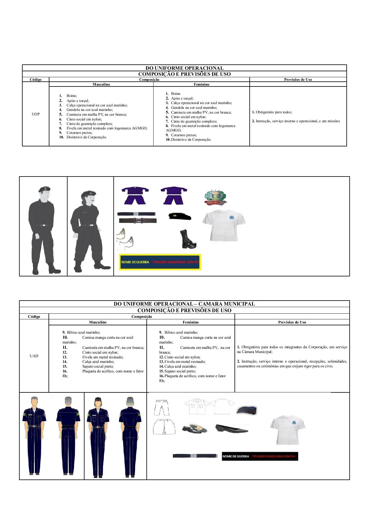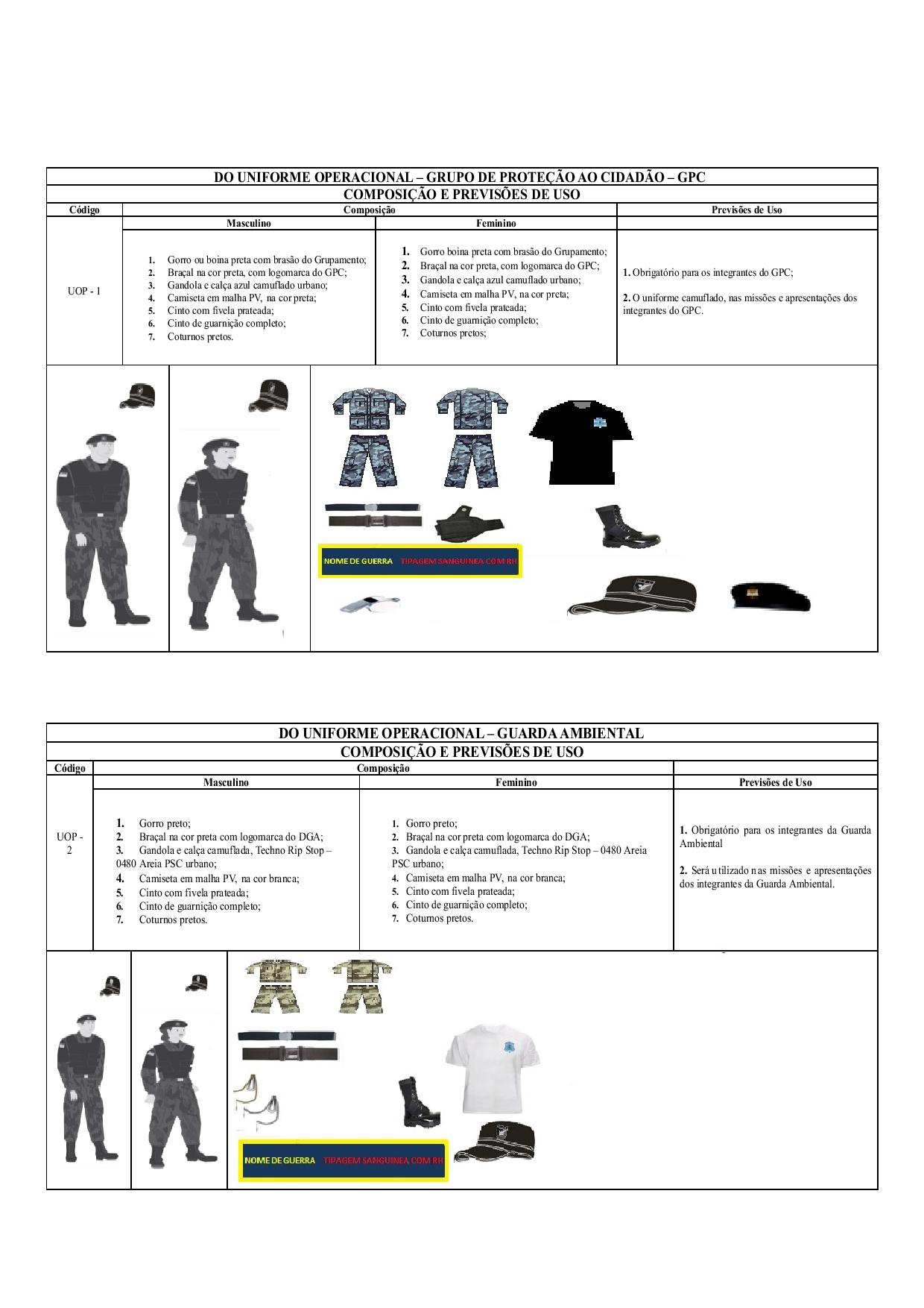 Confeccionada em tecido de ripstop, padrão camuflado urbano na cor predominante azul, com abertura frontal em toda a extensão, e fechado por zíper, padrão fecho fácil, se iniciando na altura da gola e se estendendo a aproximadamente 50 mm abaixo da cintura; o cumprimento da Gandola é aproximadamente na altura dos glúteos, de forma a ser usada por fora da calça; a lateral esquerda será anteposta ao tecido da Gandola e terá 30 mm de espessura, formando uma lapela protegida pelo tecido da Gandola; na parte superior, dois bolsos sanfonados de 133 mm X 155 mm, arrematado na parte superior, a 20 mm e, na parte inferior, a 2 mm de sua borda; ao centro do bolso, destaca-se um detalhe tipo fêmea, que se inicia a 35 mm da borda inferior, se estende por 95 mm, e se finda a 20 mm da borda superior; a parte superior do bolso é arrematada nas extremidades, para evitar que o corpo do bolso fique caído; as lapelas dos bolsos superiores são duplas, e medem 133 mm X 60 mm; no centro da segunda lapela, um orifício de 18 mm abrigará o botão que se localiza no centro superior do bolso e fará o fechamento da lapela ao bolso; ambas as lapelas serão contornadas por costuras paralelas e distantes 8 mm uma da outra, e, na lapela esquerda, haverá solução de continuidade em ambas as costuras, 7 mm após se iniciar, e por 35 mm, no sentido da esquerda (peito) para a direita (manga), espaço esse destinado a abrigar canetas; na parte inferior da frente, a altura dos quadris, dois outros bolsos, nas mesmas especificações e detalhes dos bolsos superiores, porém sem a ruptura para canetas, nas dimensões 180 mm X 200 mm; costas sem emendas, porém com tecido duplo, tendo como enchimento espuma de 5 mm de espessura, tornando o tecido almofadado, com costuras paralelas em ambos os sentidos, formando losângulos regulares de 45 mm de lado; o conjunto losangulado, será costurado em toda a parte superior que o liga à gola, bem como na linha dos ombros, 100 mm abaixo, porém, fará uma parábola sanfonada em ambos os lados, distante aproximadamente 30 mm (fechada) e 60 mm (aberta), do ponto mais próximo da manga, e 65 mm (fechada) e 85 mm (aberta), do ponto mais longe, e se estenderá da linha dos ombros, a aproximadamente 200 mm abaixo das mangas; o restante do conjunto acompanhará a costura lateral da Gandola, até a distância aproximada de 100 mm; o restante do tecido será liso, sem os losangos; a bainha da Gandola terá 20 mm de largura; a gola é do tipo colarinho duplo, inteiriço, com uma lapela de aproximadamente 150 mm de comprimento, e 25 mm de largura, destinada a unir as extremidades da gola, facultando seu uso de forma aberta ou fechada; quando não estiver sendo usada, a lapela será dobrada para dentro (abaixo da própria gola) e presa por velcro; a parte frontal, acompanhando os limites da parte losangular das costas, também será trabalhada com detalhes em losângulos, nas mesmas medidas já descritas, porém, o limite de separação entre o tecido trabalhado e o liso, não será sanfonado como nas costas. Será simplesmente costurado; os bolsos também já descritos serão sobrepostos ao tecido losangular, e se inicia, os superiores, aproximadamente a 150 mm abaixo da costura inferior da gola, (onde se encontra a lapela), e os inferiores na altura do cinto (quadris); as platinas serão da mesma cor e tecido da Gandola, de forma pentagonal, embutidas nas mangas, com 55 mm de largura na parte fixa e 45 mm na parte solta, terminando em ângulo obtuso despontando a 15 mm do seu contorno, sendo abotoado na linha do ombro, próximo ao pescoço; mangas longas com proteção losangular, devidamente almofadadas, na altura dos cotovelos; punhos de 70 mm de espessura, costuras paralelas margeando o desenho, e um botão ao centro, acrescido ainda, de uma abertura no sentido ascendente, de 100 mm a partir da costura superior do punho, sendo que o espaço da abertura terá como fundo uma lapela em forma de “V”, objetivando cortar o contato da pele com o meio, sem, contudo tirar a flexibilidade da mesma; terá ainda, na manga esquerda, um portas-caneta, medindo 145 mm X 65 mm, anteposto a um segundo portas-caneta, medindo 130 mm X 65 mm, sendo ambos arrematados por costuras paralelas em todo o corpo, e distantes 8 mm uma da outra, e costuradas no alinhamento da platina do ombro esquerdo, aproximadamente 50 mm descendo a manga esquerda. Todo o conjunto terá uma boa vestimenta de forma a não ficar apertado, nem folgado em excesso, e será costurado com linha preta e/ou marrom.