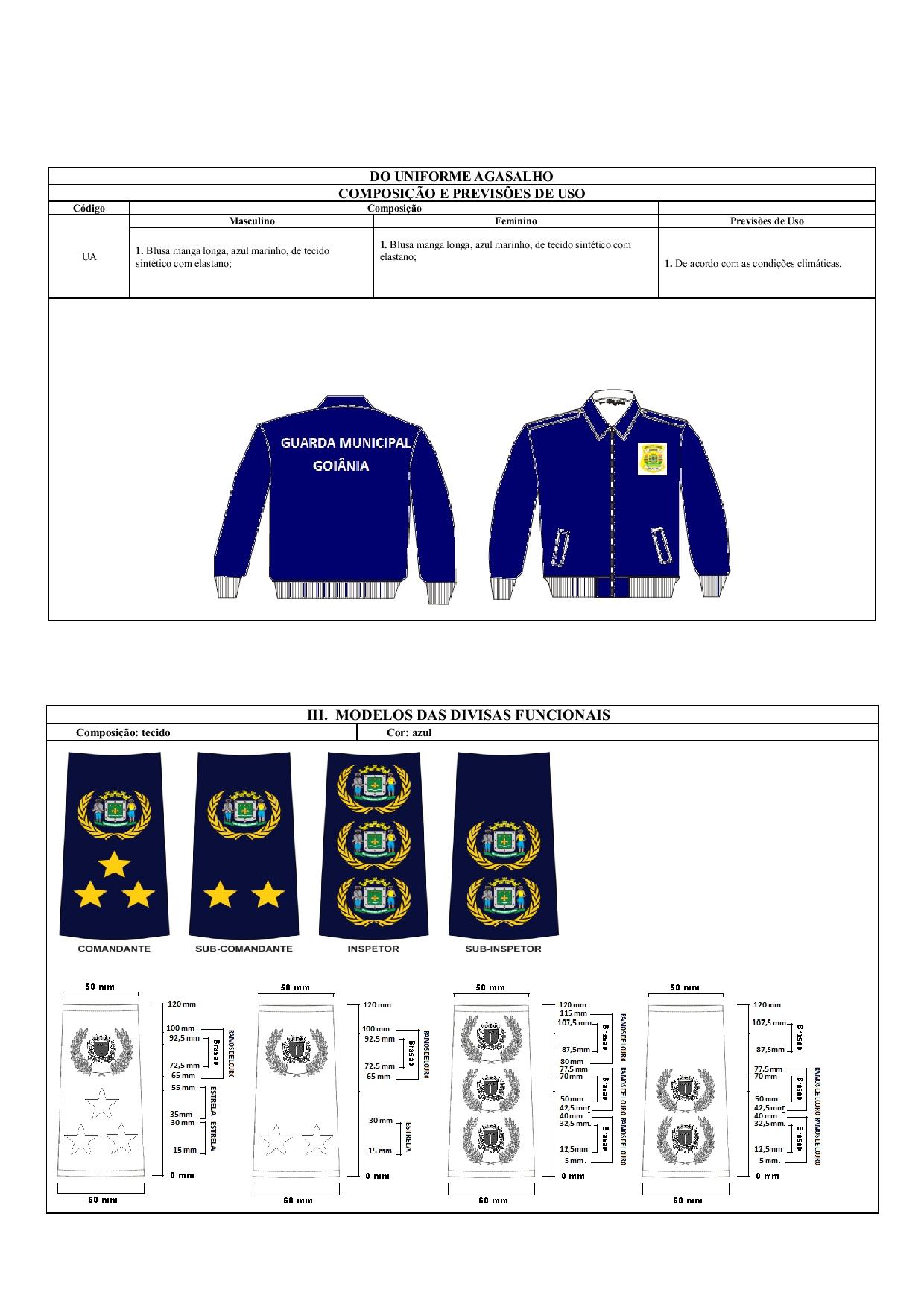 A Divisa de Inspetor é composta por 03 (três) Brasões da cidade de Goiânia cada qual rodeado por dois ramos de louro. Fabricada em tecido semelhante ao do uniforme operacional.A cor do tecido é o Azul Marinho. O formato é o que se encaixará proporcionalmente no passador de Divisa do uniforme, tanto administrativo, quanto operacional do agente.