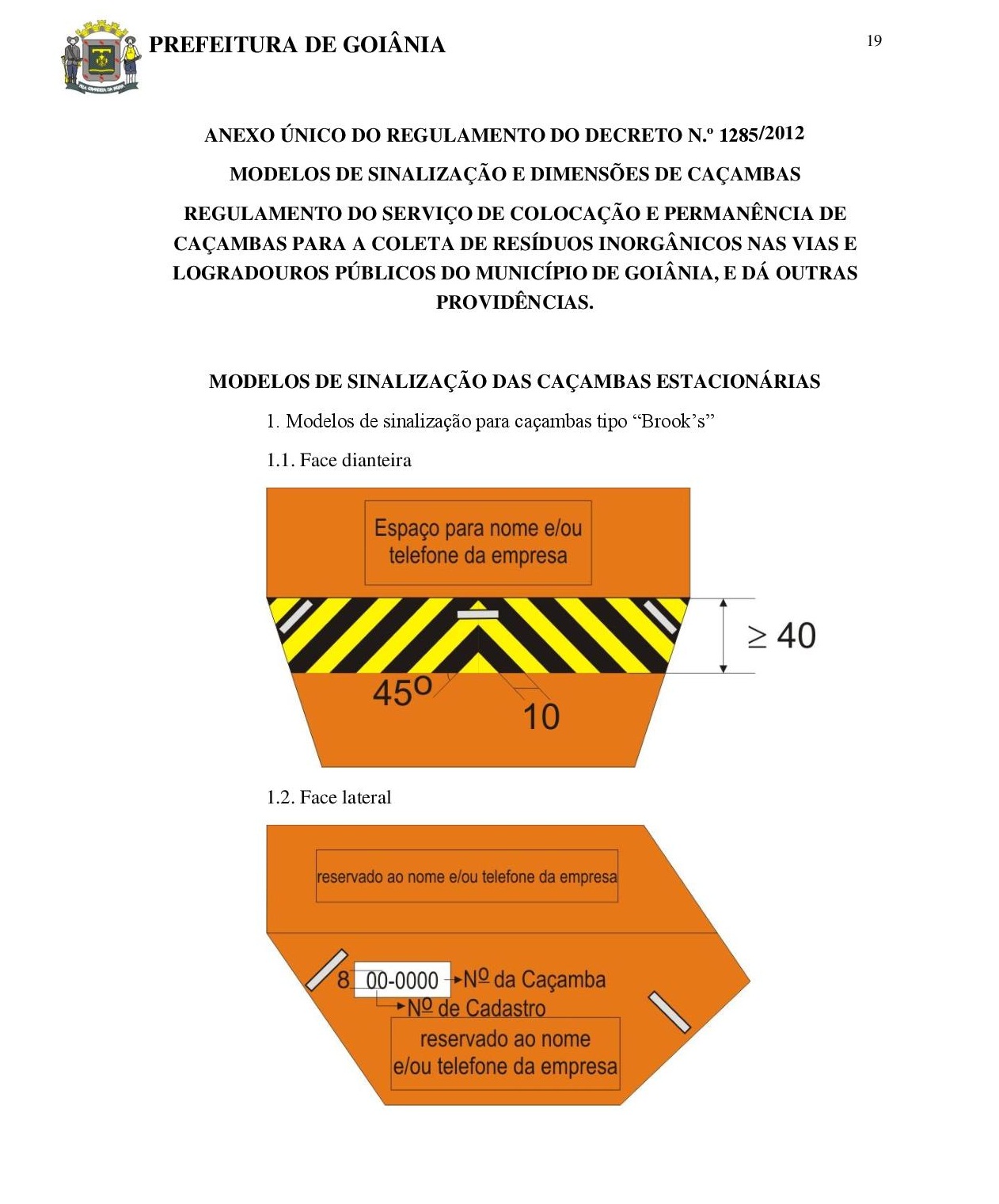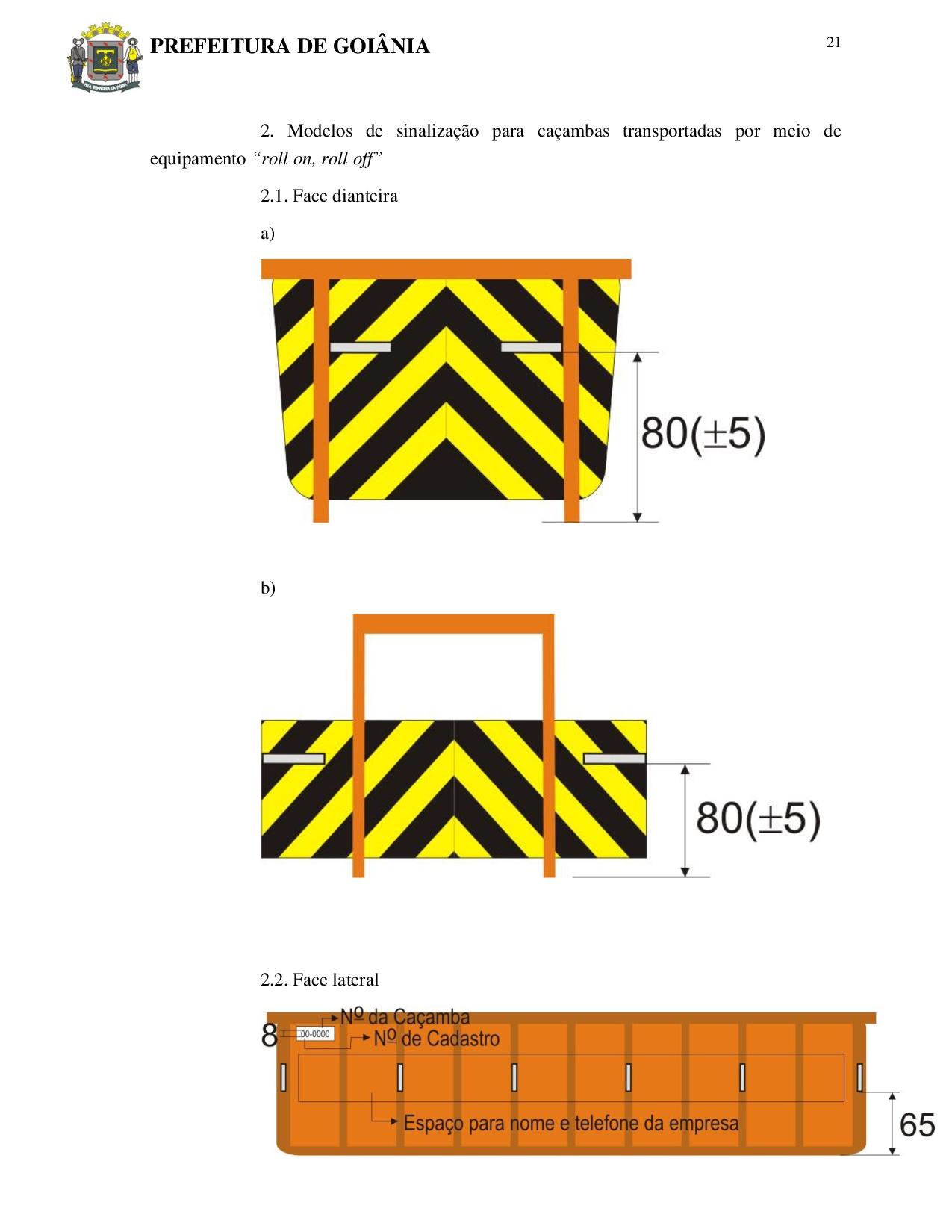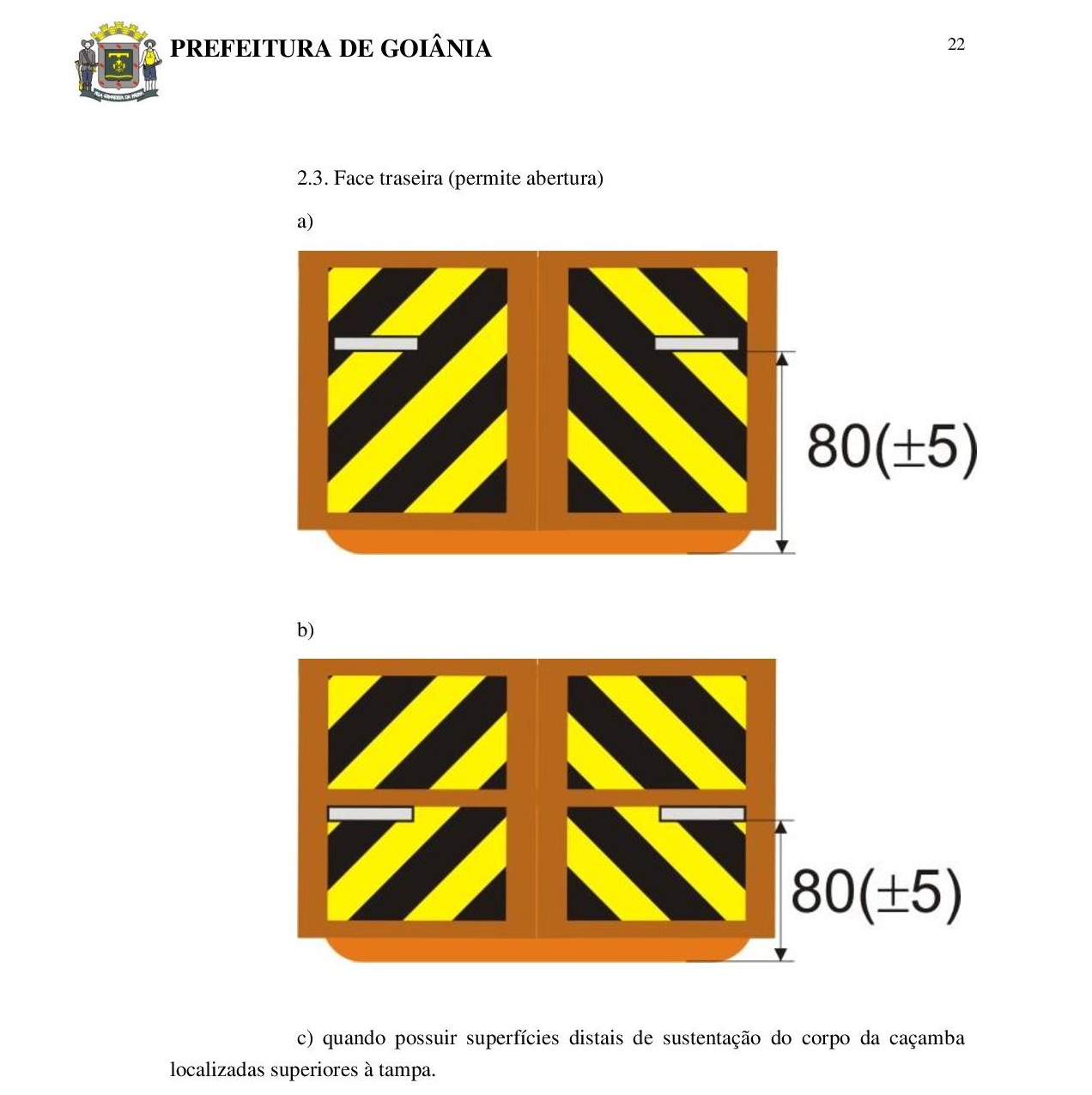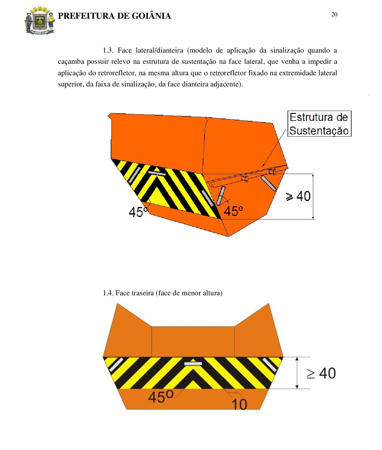 § 1º A largura das caçambas não poderá ser superior a 1,80m (um metro e oitenta centímetros) e altura mínima de 0,70m (setenta centímetros) para o lado de visão frontal dos condutores de veículos, para apenas uma das faces da caçamba; sendo que as demais faces deverão ter no mínimo 1,20m (um metro e vinte centímetros) de altura.