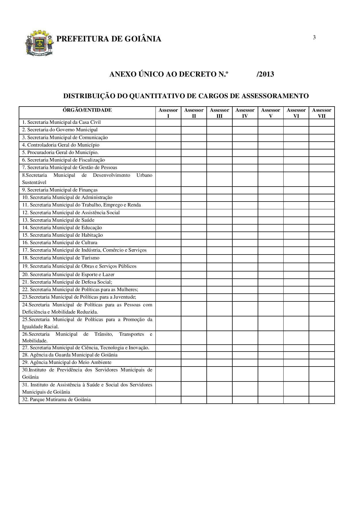 Art. 3º Ficam delegadas ao Secretário do Governo Municipal as competências estabelecidas no art. 3º, da Lei n.º 9.218, de 28 de dezembro de 2012, referente a distribuição do quantitativo dos cargos de Assessor e a lotação dos servidores, de acordo com a necessidade e o dimensionamento de cada órgão/entidade da Administração Municipal, relacionados no formulário Modelo, constante do Anexo único, que a este acompanha