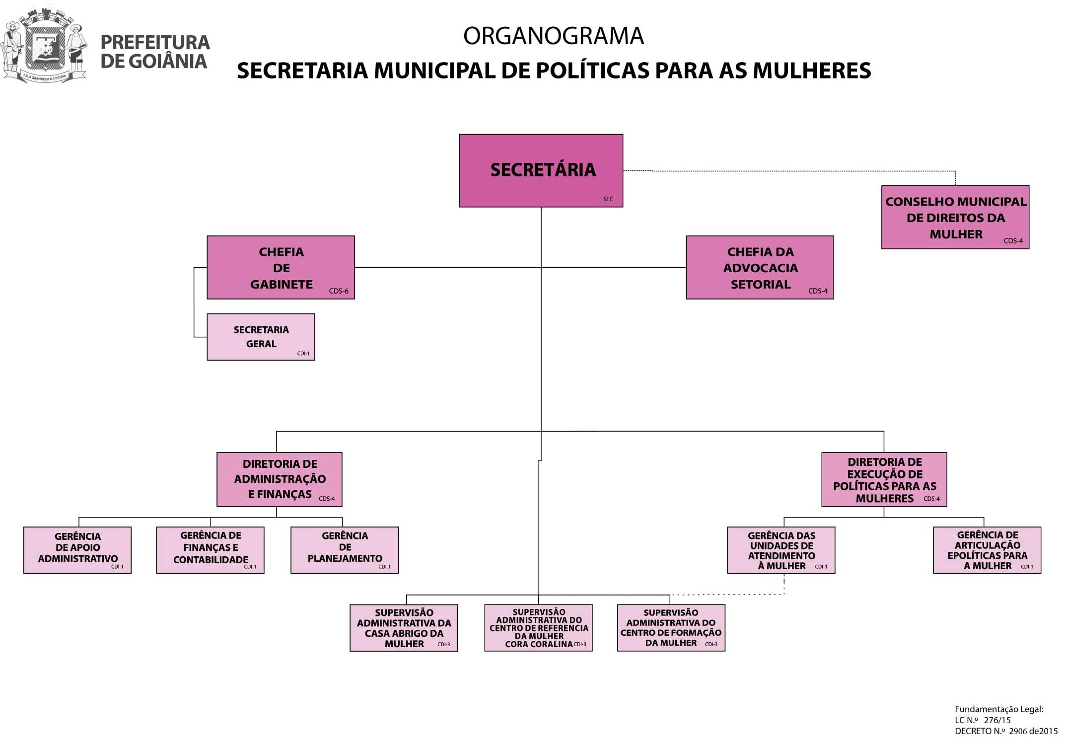 § 1º A Secretaria Municipal de Política para as Mulheres – SMPM será dirigida pela Secretária, as Diretorias por Diretores, as Gerências por Gerentes, as Supervisões por Supervisores nomeados pelo Chefe do Poder Executivo para os respectivos cargos de provimento em comissão de direção e assessoramento superior, constantes do Anexo I, da Lei Complementar nº 276/2015.