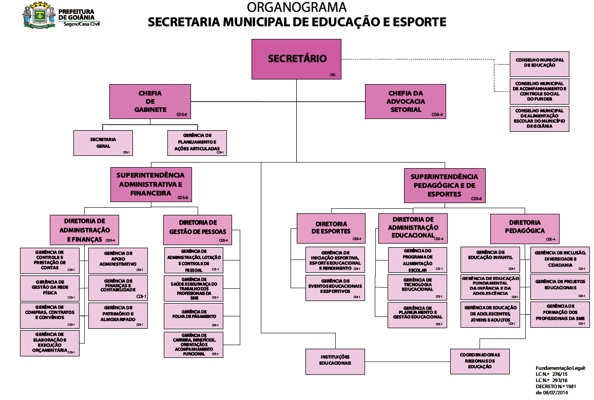 § 2º No desempenho de suas competências a SME será assistida pelo Conselho Municipal de Educação, Conselho Municipal de Esporte e Lazer e o Conselho de Alimentação Escolar do Município de Goiânia, órgãos de caráter consultivo, deliberativo, fiscalizador e normativo do Sistema Municipal de Educação e de Esporte acerca dos temas de suas competências definidos em seus regimentos próprios.(Redação do Decreto nº 1.981, de 2016.)