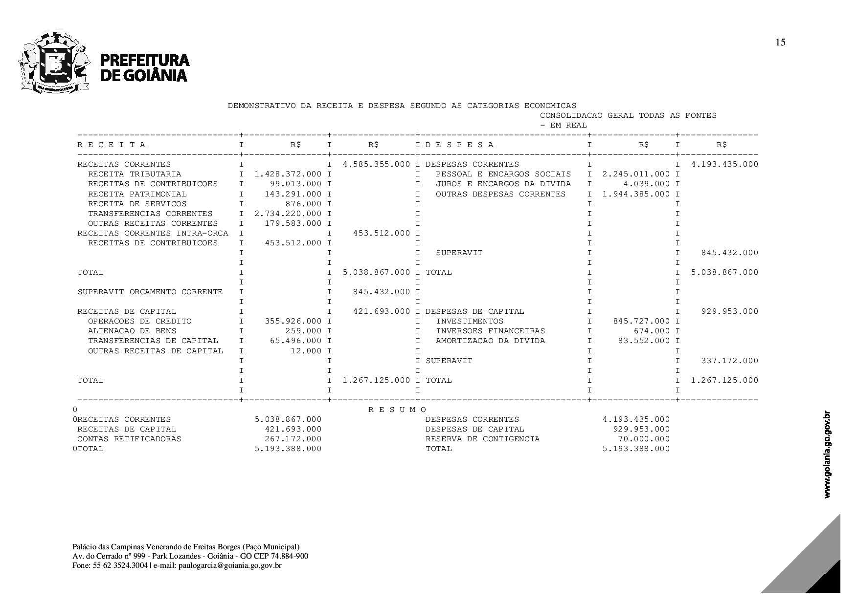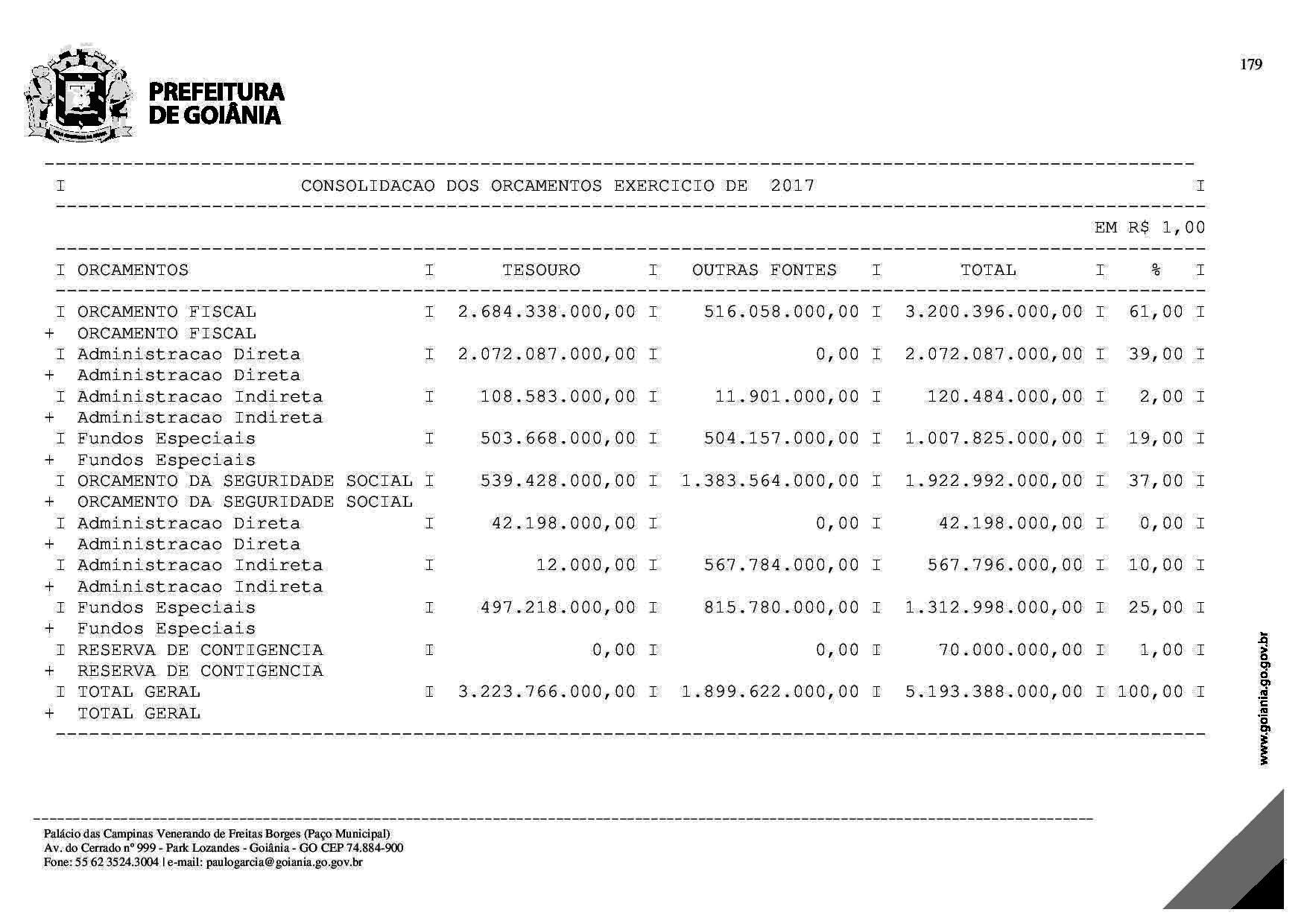 Art. 1º Esta Lei estima a receita do Município de Goiânia para o exercício financeiro de 2017, no montante de R$5.193.388.000 (cinco bilhões, cento e noventa e três milhões, trezentos e oitenta e oito mil reais) e fixa a despesa em igual valor, nos termos do art.165, § 5º, da Constituição Federal/88, e da Lei n° 9.872 de 26 de julho de 2016, Lei de Diretrizes Orçamentárias para o exercício de 2017, compreendendo: