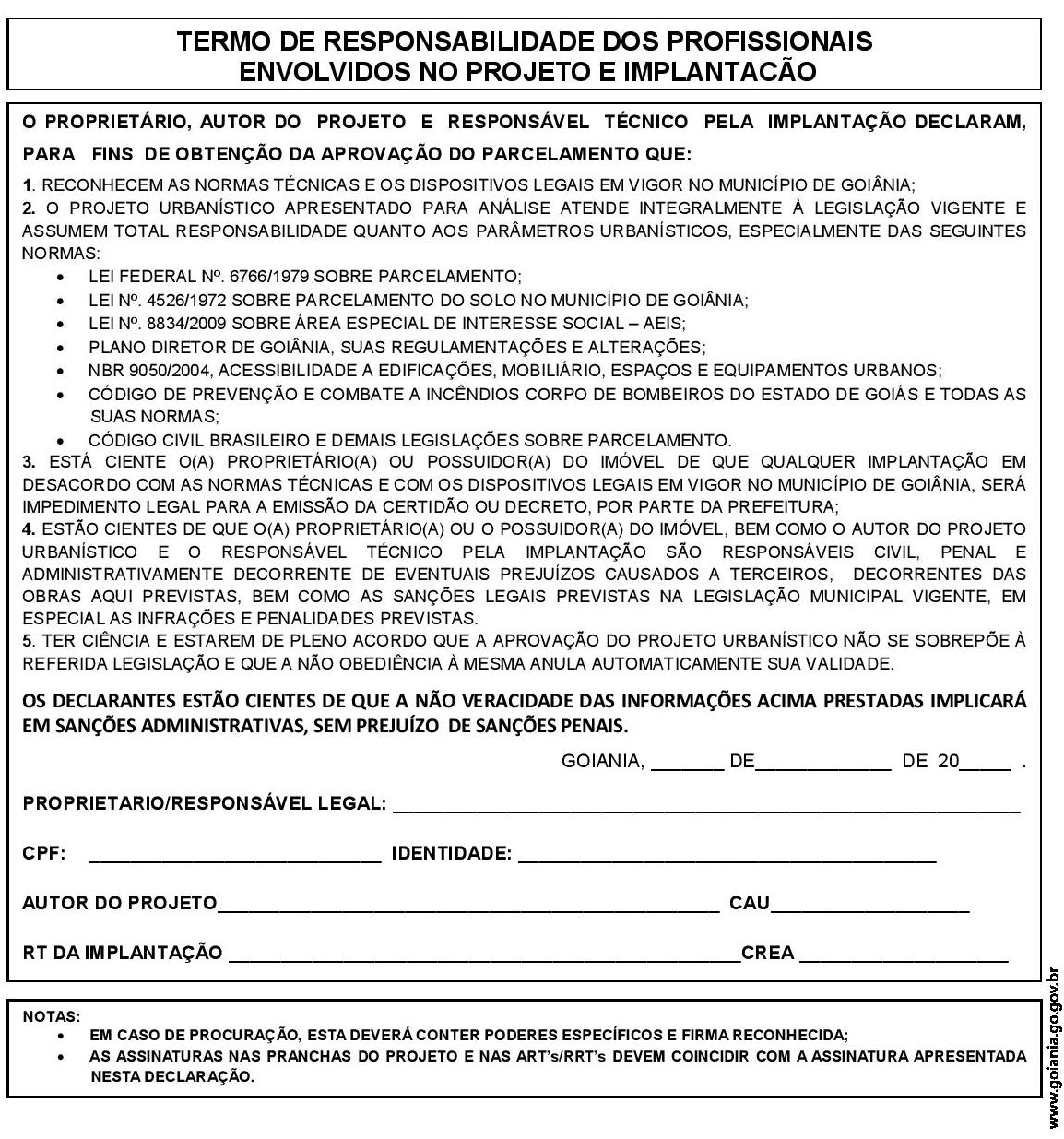 6.4. As análises e aprovações feitas pela Equipe Técnica da Prefeitura Municipal de Goiânia/SEPLANH não eximem o autor do projeto e responsável técnico pela implantação de qualquer responsabilidade profissional, pelo cumprimento de normas técnicas e da legislação em vigor;