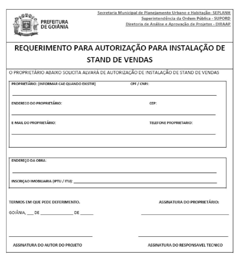 6.1 - Requerimento de alvará de autorização para instalação de Stand de Vendas, preenchido e assinado conforme modelo;