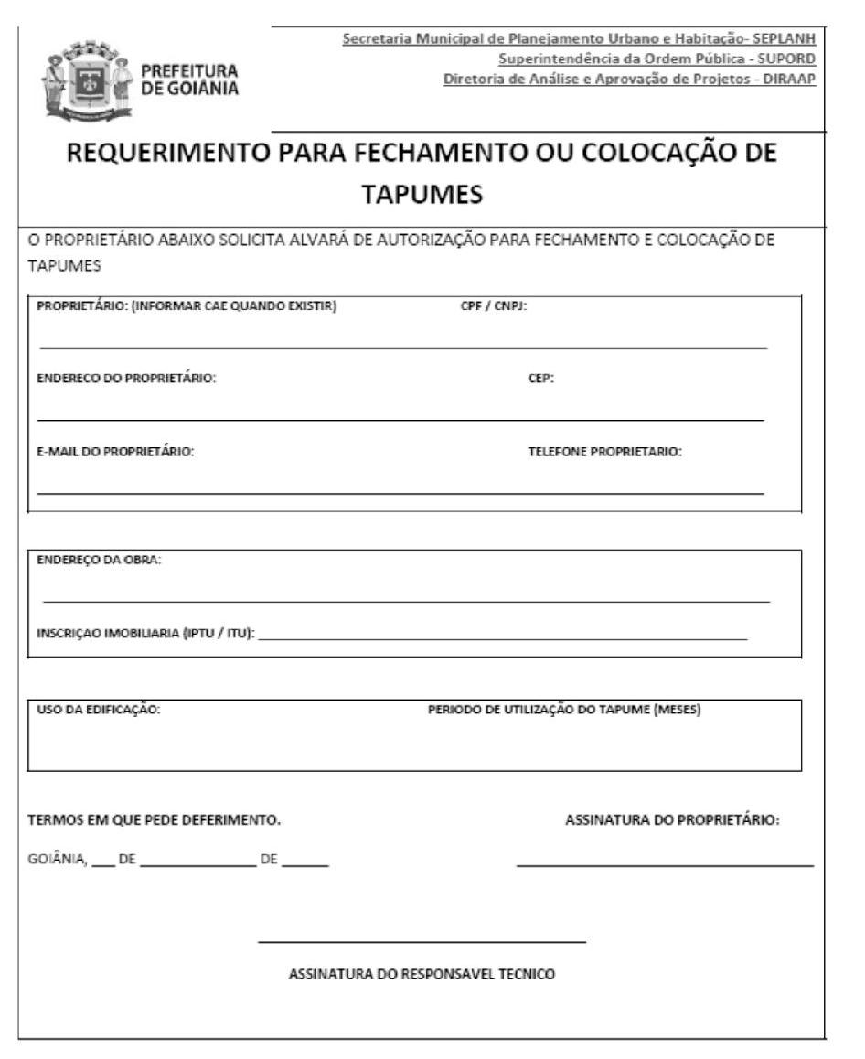 7.1 - Requerimento de alvará de autorização para tapumes, preenchido e assinado conforme modelo;