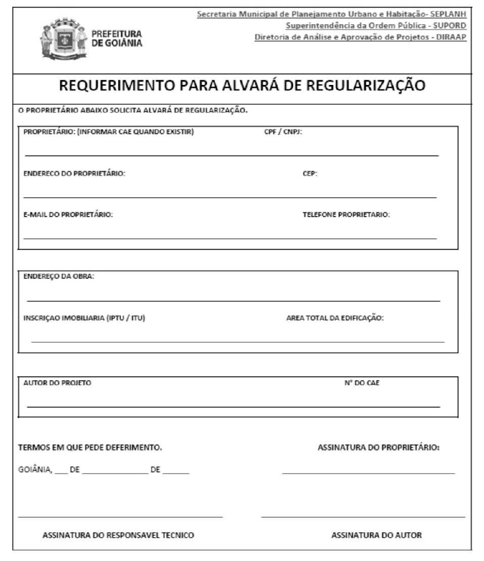 12.1 - Requerimento de alvará de regularização, preenchido e assinado conforme modelo;