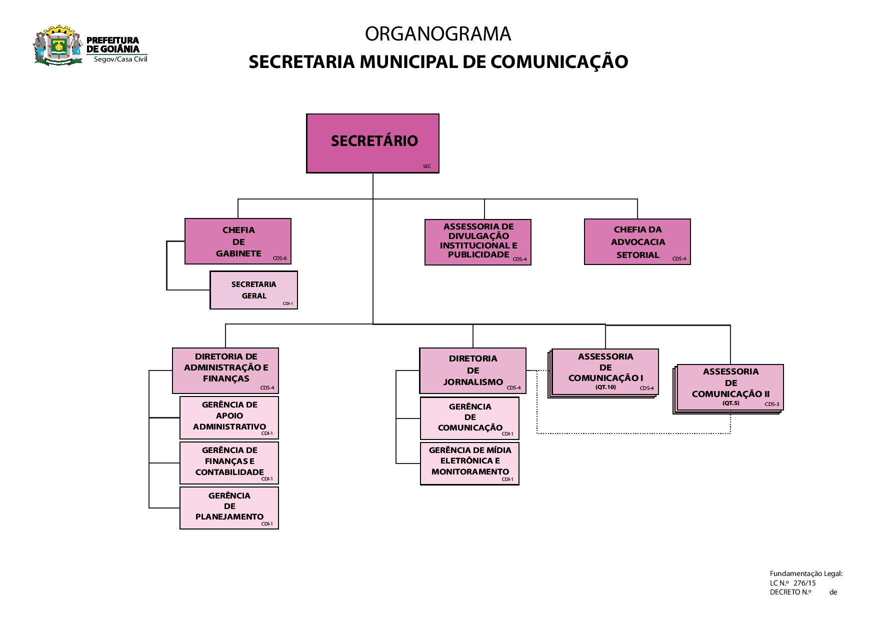 Art. 1º A Secretaria Municipal de Comunicação (SECOM) integra a Administração Direta do Poder Executivo do Município de Goiânia, conforme o disposto no art. 11, inciso I, alínea “f”, da Lei Complementar nº 276, de 03 de junho de 2015 e tem por finalidade coordenar a execução da Política de Comunicação do Poder Executivo do Município de Goiânia e dar suporte aos órgão/entidades municipais em suas relações com os veículos de comunicação e na divulgação de quaisquer ações relativas à Administração Municipal.