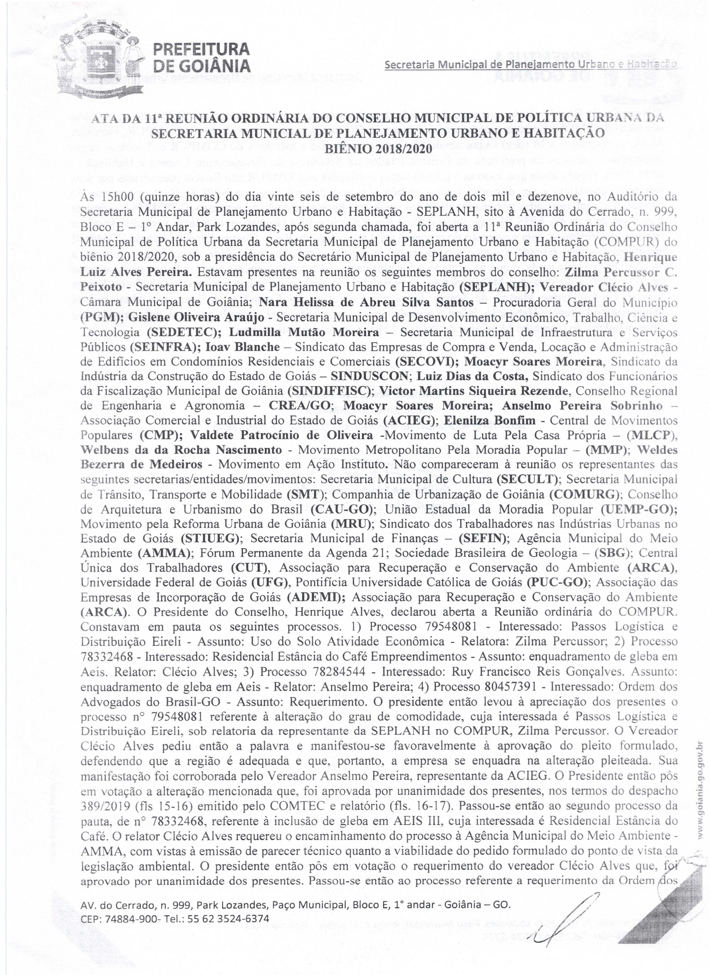 Art. 1º Fica Homologada a Decisão do Plenário do Conselho Municipal de Política Urbana (COMPUR), na parte relativa ao Processo nº 7.954.808-1/2019, proferida na 11ª reunião ordinária, realizada no dia 26 de setembro de 2019, conforme ata em anexo, favorável à ajustes no Grau de Incomodidade até GI-4, da via Coletora Alameda dos Flamboyant – antiga Rua Arisco (via coletora de Pista Dupla) e Rua Iracema (Via Local 2 Pista Única) Quadra Chácara, Lt. 05, Fazenda Retiro, com a observação de que tratando-se de Macroprojetos, ou seja, com área superior a 5.000 m², será indispensável os estudos e relatórios de EIT/RIT e EIV/RIV.