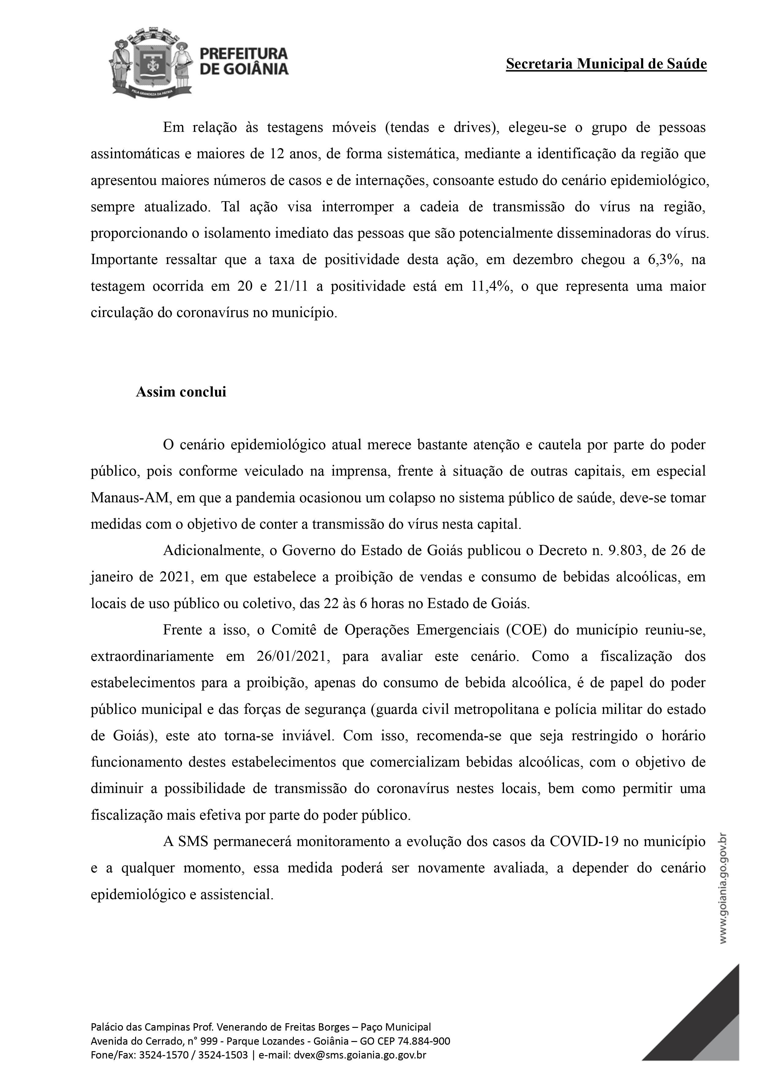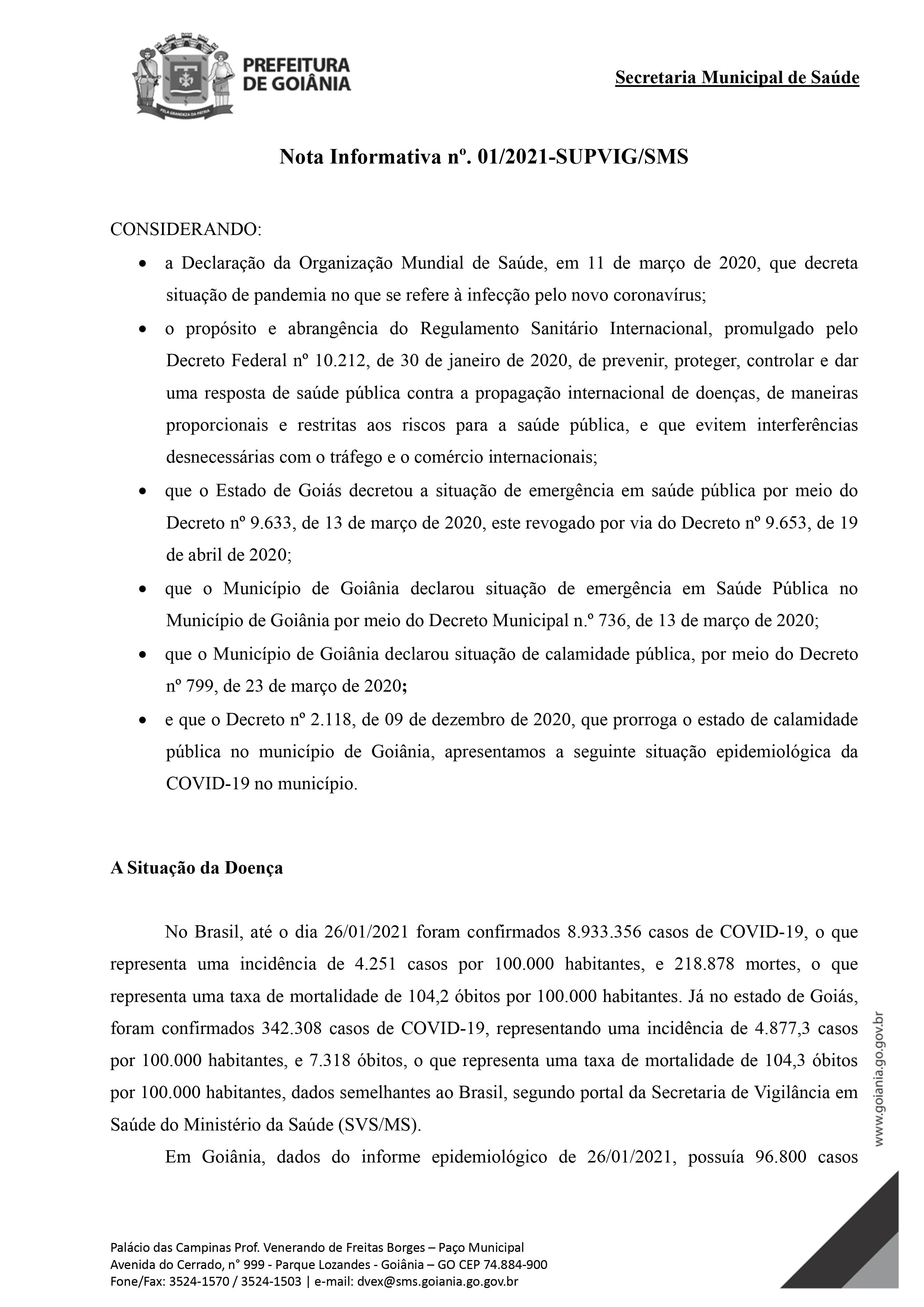 O PREFEITO DE GOIÂNIA, no uso de suas atribuições legais previstas no art. 11, XXI; no art. 115, II, IV e VIII da Lei Orgânica do Município de Goiânia e o disposto na Lei Federal n.° 13.979, de 06 de fevereiro de 2020; na Lei n.° 8.741, de 29 de dezembro de 2008; na Portaria n.° 454, de 20 de março de 2020, do Ministério da Saúde; no art. 4°, do Decreto estadual n.° 9.653, de 19 de abril de 2020, na Nota Informativa n.° 01/2021-SUPVIG/SMS, a este anexada, e