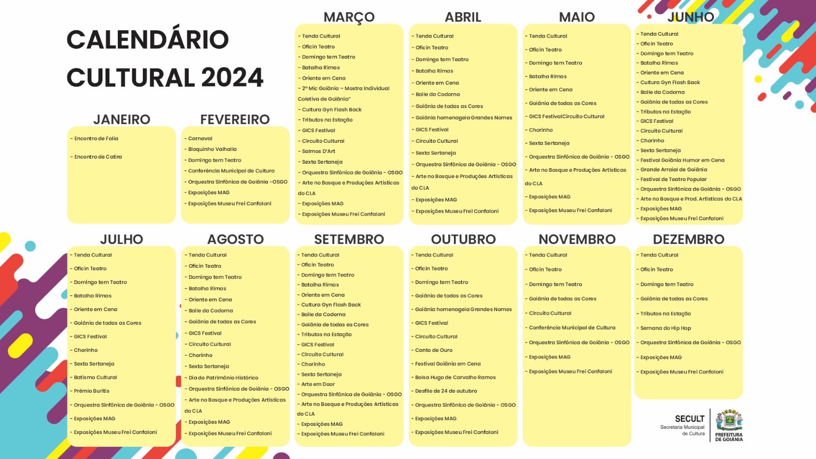 O Calendário Cultural 2024 contém todos os eventos PREVISTOS para acontecer durante o ano. Datas, locais e horários estão sujeitos a alteração conforme necessidade, imprevistos, demandas e disponibilidade de agenda dos artistas e autoridades. Portanto, aqui está o calendário oficial, mas trata-se de um planejamento dos eventos, que serão confirmados e divulgados às vésperas de cada realização.