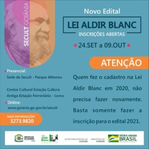 A Prefeitura de Goiânia, por meio da Secretaria Municipal de Cultura (Secult), publicou nesta sexta-feira, 17, no Diário Oficial, o Edital de Chamada Pública para mais um período de inscrição da Lei Aldir Blanc. Artistas, grupos e profissionais do setor cultural (pessoa física e jurídica) terão o prazo de 24 de setembro a 9 de outubro para realizarem o credenciamento gratuito no site da Prefeitura ou pessoalmente na Gerência de Projetos Culturais e Planejamento Estratégico, na sede da Secult, no Parque Atheneu, ou ainda no Centro Cultural Estação Cultura, antiga Estação Ferroviária, no Centro.