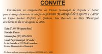 A Secretaria Municipal de Esporte e Lazer de Goiânia (Semel) está convidando os integrantes do Fórum Municipal de Esporte e Lazer de Goiânia, para a entrega oficial da Minuta do Projeto de Lei de criação do Sistema Municipal de Esporte e Lazer em audiência com o Prefeito de Goiânia, Iris Rezende, às 8 horas do dia 27 de agosto de 2008, no 6º Andar do Paço Municipal de Goiânia.